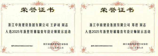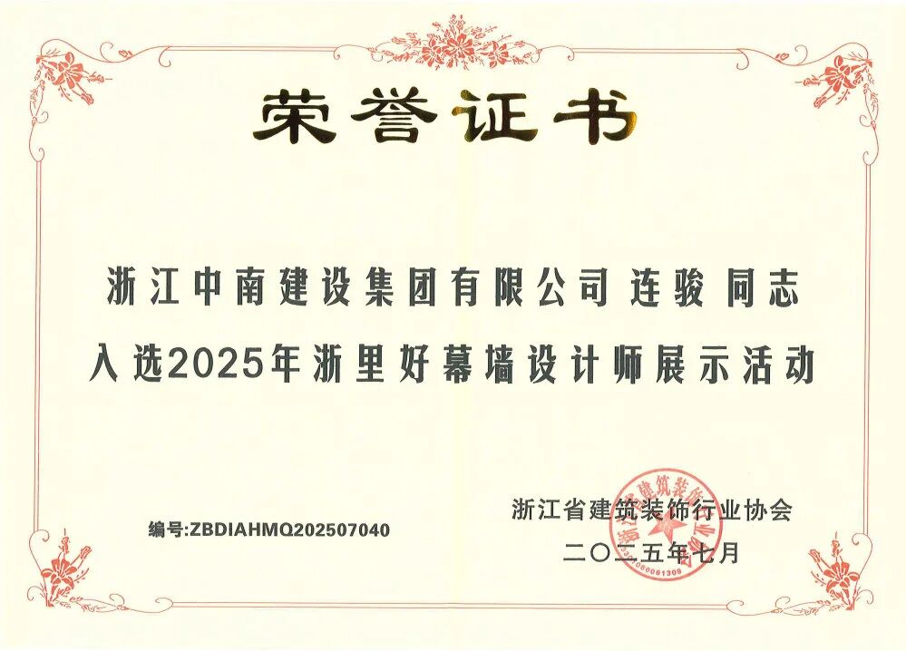 浙江中南建设集团有限公司 获评“浙里好幕墙企业” 浙江中南幕墙设计研究院设计师 连骏 获评“浙里好幕墙设计师” 浙江中南幕墙设计研究院设计师 王萨翊、邓进 获评“浙里好幕墙青年设计师”