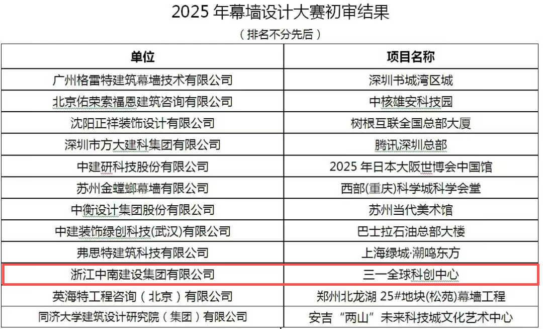 来自全国各地的幕墙设计领域专家、企业家、青年设计师代表齐聚一堂,共同探讨行业发展新趋势、新规则、新举措。浙江中南幕墙设计研究院院长梁曙光受邀参 ![]() 会上,大家共同听取了《2025幕墙设计及顾问咨询行业工作主题汇报》,全面理解行业分会阶段性工作任务和长久性工作思路;接收了不同企业关于“新生态、新技术、新材料”的专题分享;并在交流环节针对行业关注话题展开热烈而深入的沟通,阐述自身所亲历的实际项目应用经验、有关幕墙节能的最新研究成果等。 会议同期公布了"2025设计大奖赛"的初评结果。依据评选流程,各参赛作品严格按照参评标准,从设计创新性、技术可行性和视觉美观性等多个维度得分。 共计有12个项目成功进入到下一轮评选。由浙江中南幕墙设计研究院选送项目“三一全球科创中心”名列其中。